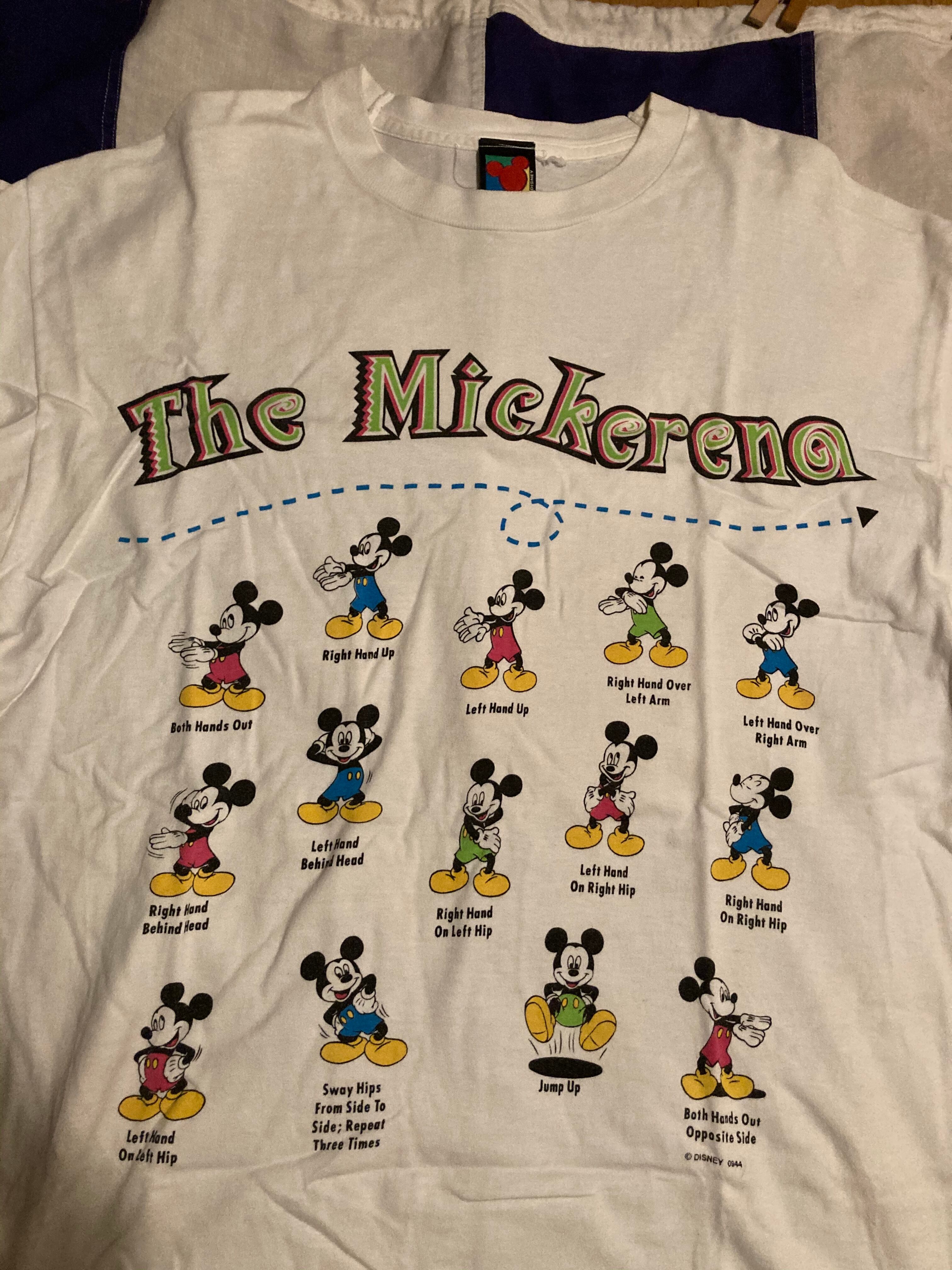 ご覧頂きありがとうございます。本商品は古着屋で購入した物となります。古着ではミッキーTは数多く見かける定番品となりますが、このデザインは大変珍しいかと思います。サイズ感はメンズXL(肩幅55センチ 身幅58センチ 着丈74センチ おおよそです)、正に今需要の高いサイズ感です。一部汚れありますが、古着慣れした方なら気にならないかと思います。コレクターの方、人と違ったデザインをお探しの方にお勧めです。